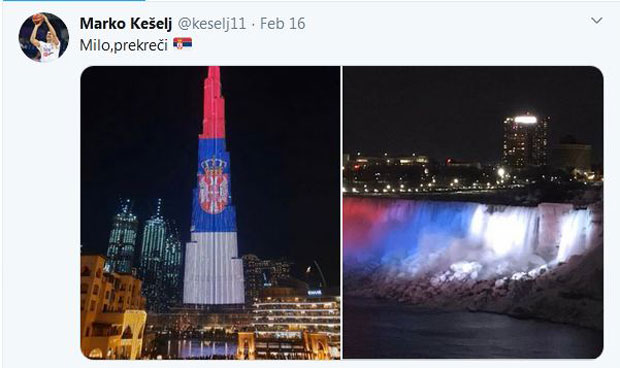 Он је на друштвеним мрежама објавио фотографије “Бурџ Калифе” и “Нијагариних водопада” који су на дан државности Србије били у бојама српске заставе.